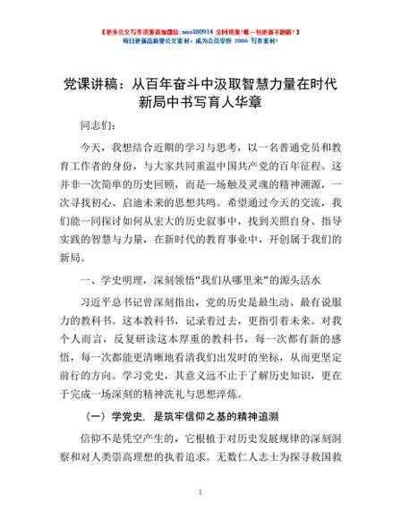 / 党课讲稿:从百年奋斗中汲取智慧力量 在时代新局中书写育人华章