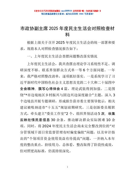 / 市政协副主席2025年度民主生活会对照检查材料