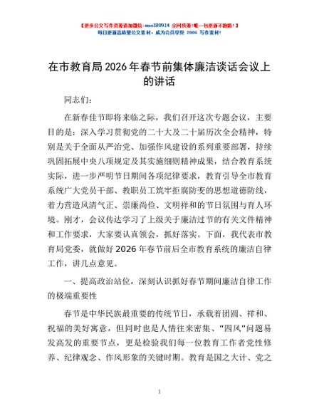 / 在市教育局2026年春节前集体廉洁谈话会议上的讲话