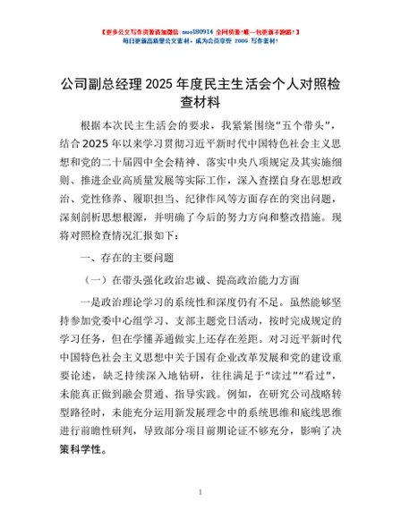/ 公司副总经理2025年度民主生活会个人对照检查材料