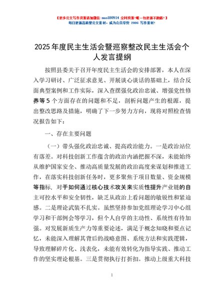 / 2025年度民主生活会暨巡察整改民主生活会个人发言提纲