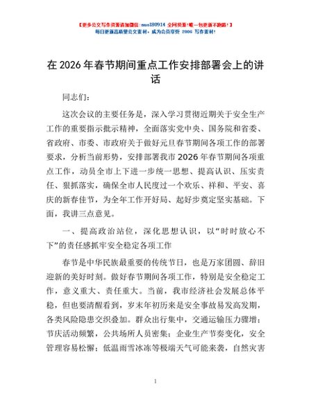 / 在2026年春节期间重点工作安排部署会上的讲话