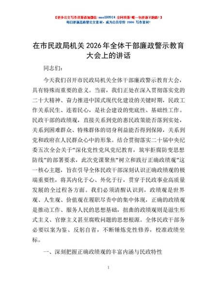 / 在市民政局机关2026年全体干部廉政警示教育大会上的讲话