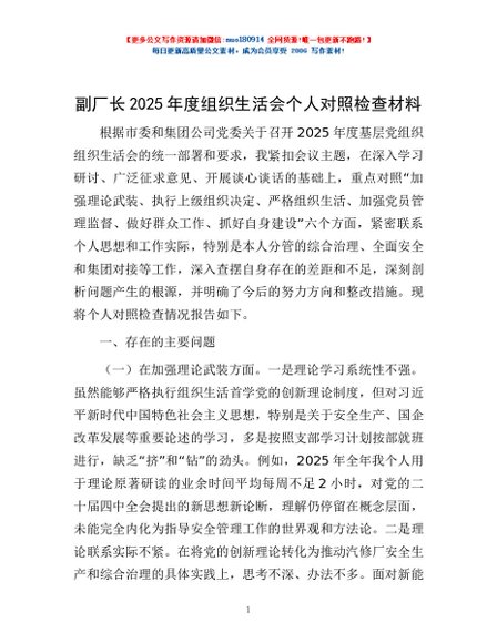 / 副厂长2025年度组织生活会个人对照检查材料
