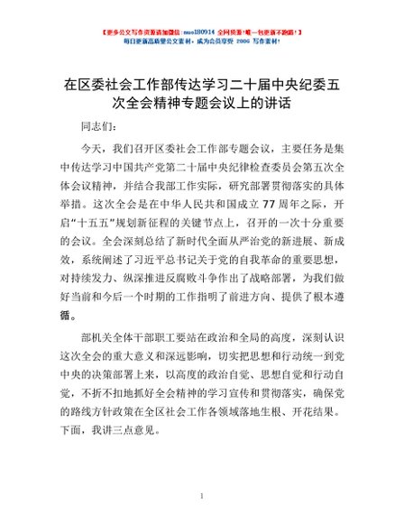 / 在区委社会工作部传达学习二十届中央纪委五次全会精神专题会议上的讲话