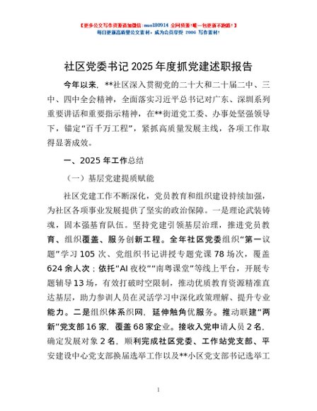 / 社区党委书记2025年度抓党建述职报告