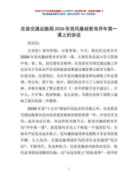 / 在县交通运输局2026年党风廉政教育开年第一课上的讲话