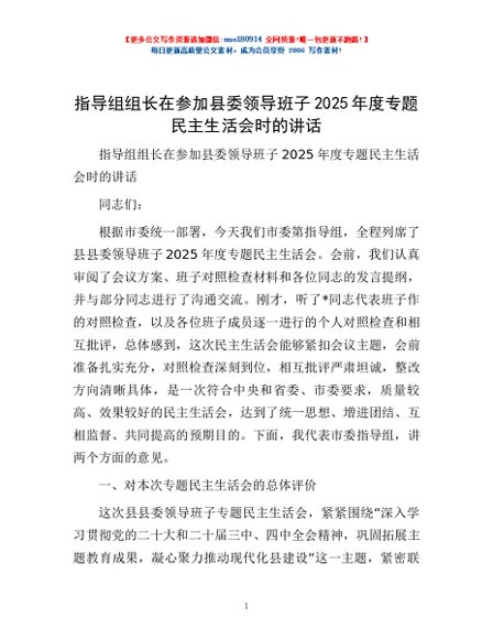 / 指导组组长在参加县委领导班子2025年度专题民主生活会时的讲话