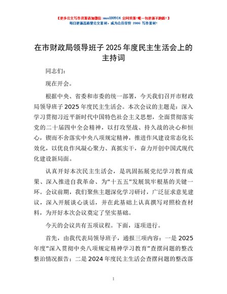 / 在市财政局领导班子2025年度民主生活会上的主持词