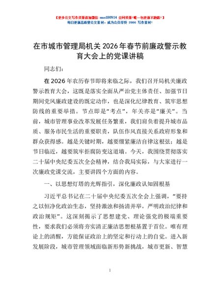 / 在市城市管理局机关2026年春节前廉政警示教育大会上的党课讲稿