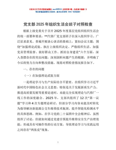 / 党支部2025年组织生活会班子对照检查