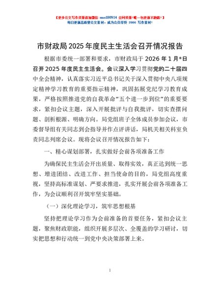 / 市财政局2025年度民主生活会召开情况报告