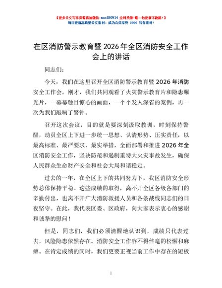 / 在区消防警示教育暨2026年全区消防安全工作会上的讲话