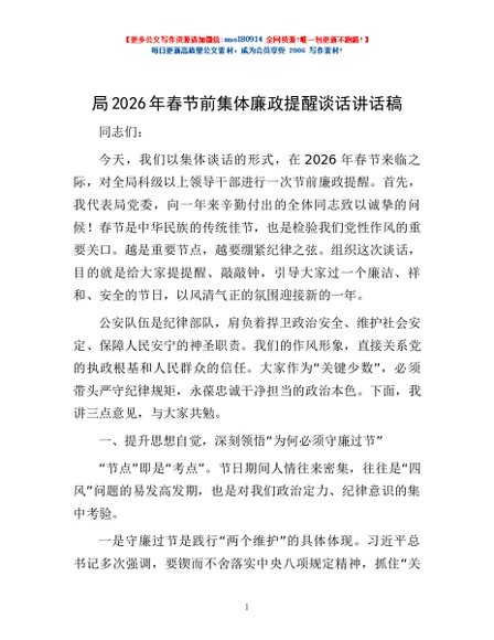 / 局2026年春节前集体廉政提醒谈话讲话稿