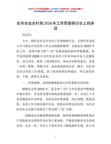 / 在市农业农村局2026年工作思路研讨会上的讲话