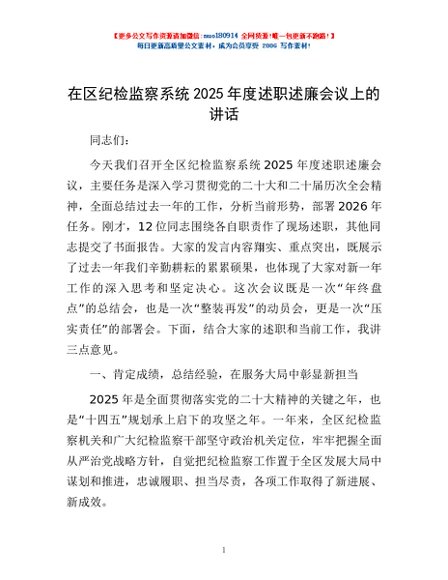 / 在区纪检监察系统2025年度述职述廉会议上的讲话