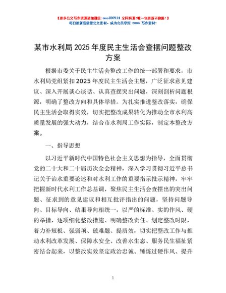 / 某市水利局2025年度民主生活会查摆问题整改方案