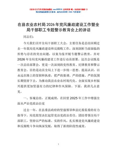 / 在县农业农村局2026年党风廉政建设工作暨全局干部职工专题警示教育会上的讲话