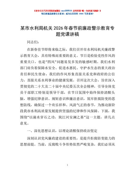 / 某市水利局机关2026年春节前廉政警示教育专题党课讲稿