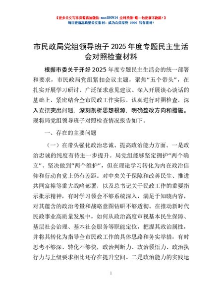 / 市民政局党组领导班子2025年度专题民主生活会对照检查材料
