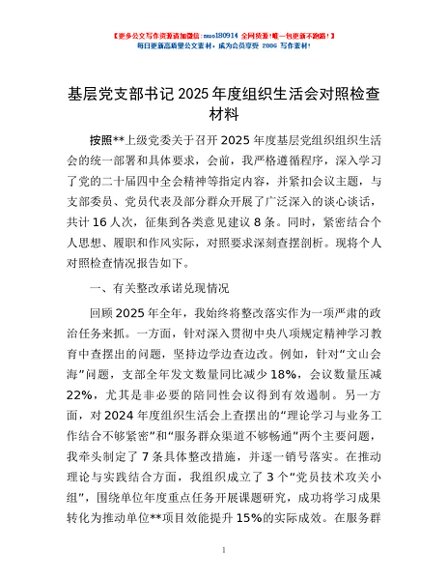 / 基层党支部书记2025年度组织生活会对照检查材料