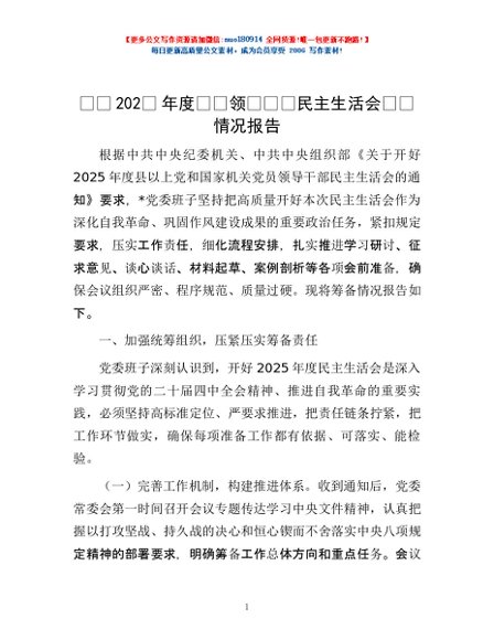 / 党委2025年度党员领导干部民主生活会筹备情况报告