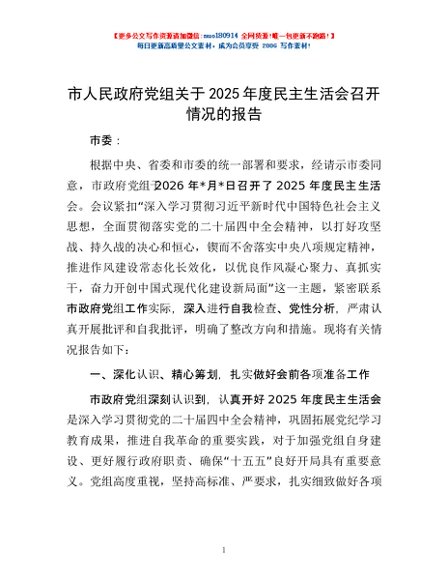/ 市人民政府党组关于2025年度民主生活会召开情况的报告