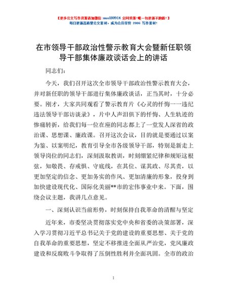/ 在市领导干部政治性警示教育大会暨新任职领导干部集体廉政谈话会上的讲话