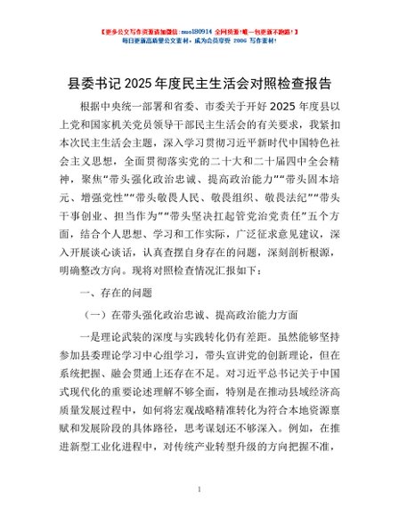 / 县委书记2025年度民主生活会对照检查报告
