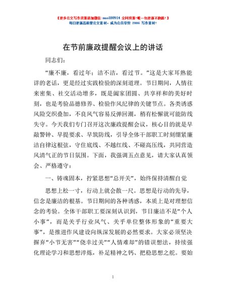 / 在节前廉政提醒会议上的讲话