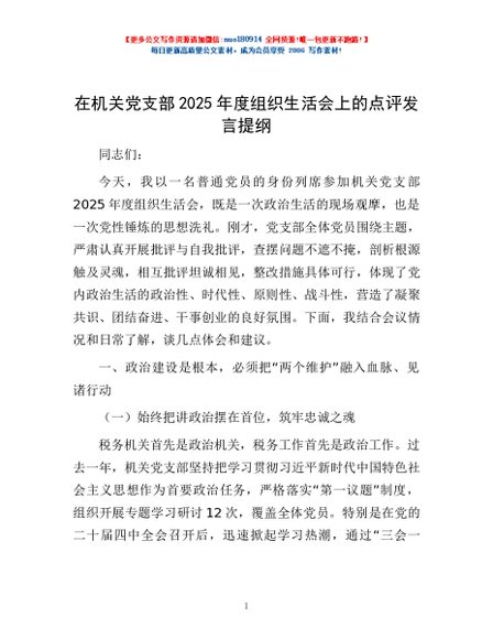 / 在机关党支部2025年度组织生活会上的点评发言提纲