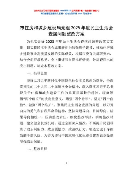 / 市住房和城乡建设局党组2025年度民主生活会查摆问题整改方案