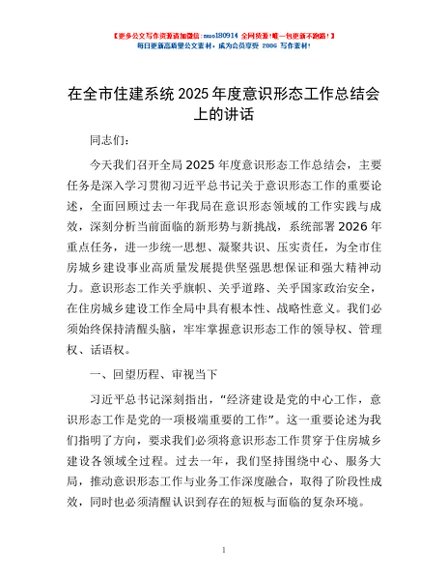 / 在全市住建系统2025年度意识形态工作总结会上的讲话