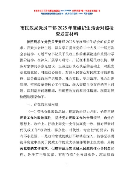 / 市民政局党员干部2025年度组织生活会对照检查发言材料