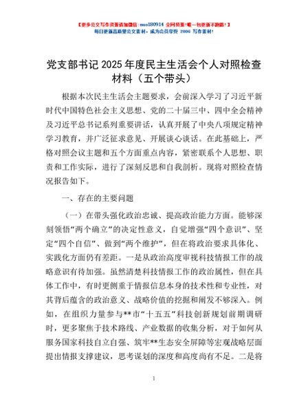 / 党支部书记2025年度民主生活会个人对照检查材料(五个带头)