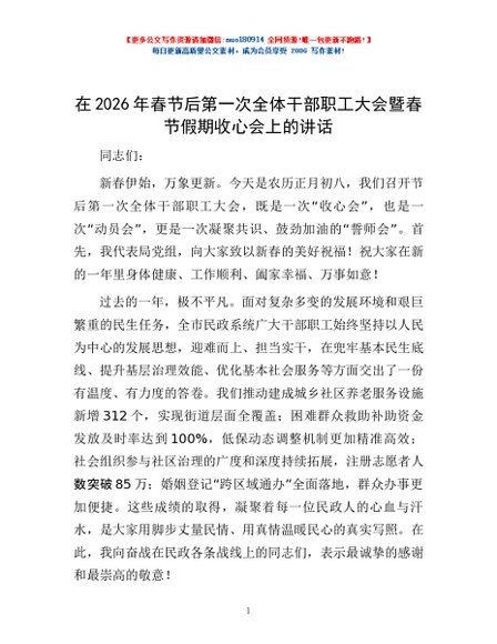 / 在2026年春节后第一次全体干部职工大会暨春节假期收心会上的讲话