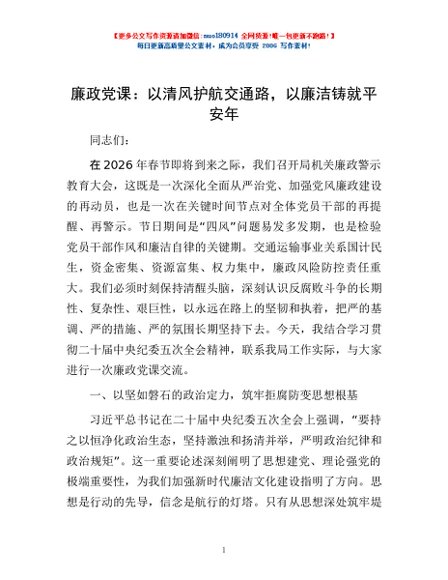 廉政党课:以清风护航交通路,以廉洁铸就平安年