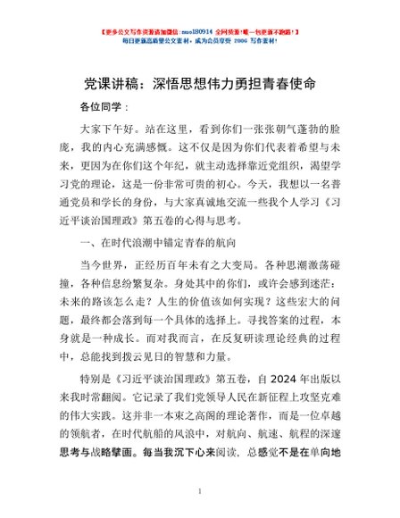 / 党课讲稿:深悟思想伟力 勇担青春使命