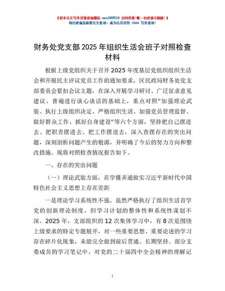 / 财务处党支部2025年组织生活会班子对照检查材料