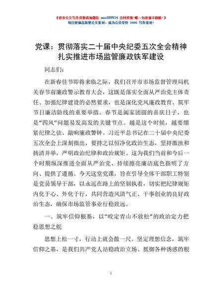 / 党课:贯彻落实二十届中央纪委五次全会精神 扎实推进市场监管廉政铁军建设