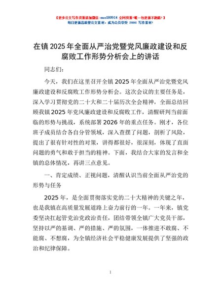 / 在镇2025年全面从严治党暨党风廉政建设和反腐败工作形势分析会上的讲话