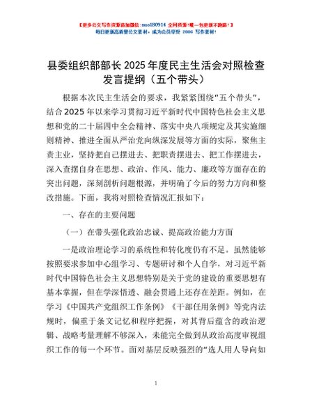/ 县委组织部部长2025年度民主生活会对照检查发言提纲(五个带头)