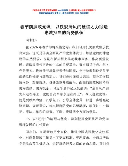 春节前廉政党课:以铁规清风的硬核之力锻造忠诚担当的商务队伍