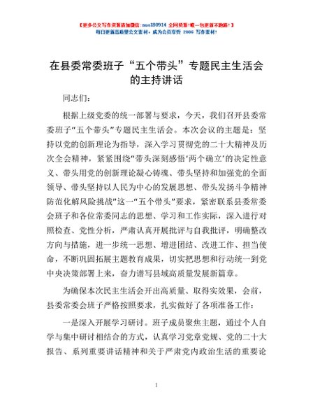 / 在县委常委班子“五个带头”专题民主生活会的主持讲话