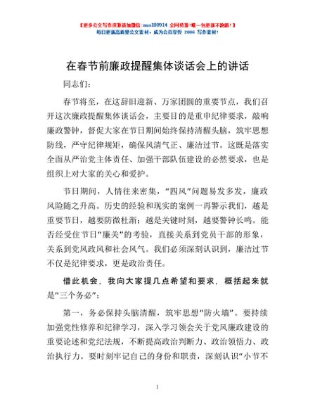 / 在春节前廉政提醒集体谈话会上的讲话