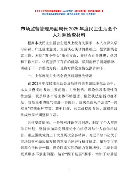 / 市场监督管理局副局长2025年度民主生活会个人对照检查材料