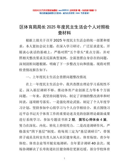/ 区体育局局长2025年度民主生活会个人对照检查材料