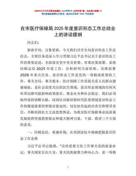/ 在市医疗保障局2025年度意识形态工作总结会上的讲话提纲
