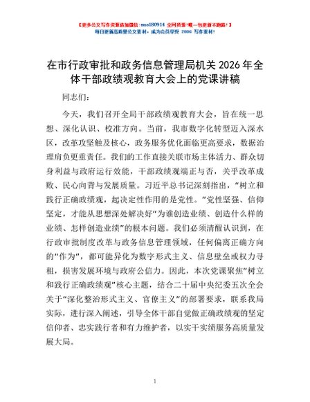 / 在市行政审批和政务信息管理局机关2026年全体干部政绩观教育大会上的党课讲稿