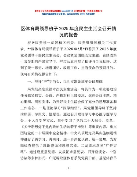 / 区体育局领导班子2025年度民主生活会召开情况的报告